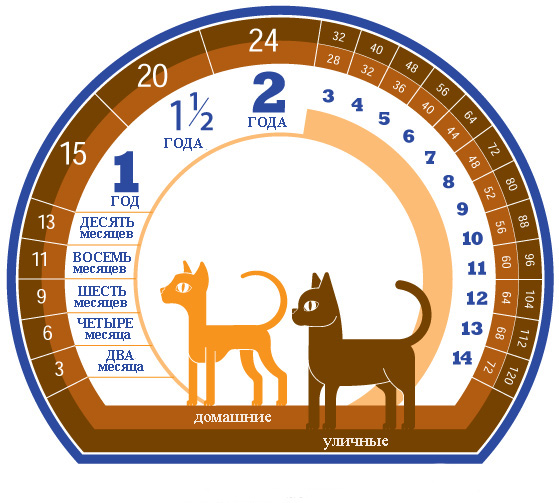 Примечание: Следует помнить, что кошачья, жизнь на открытом воздухе протекает гораздо быстрее, возможно даже в два раза быстрее, чем домашние кошки. На нижней части этой статьи, вы увидете диаграмму для легкого сравнения.